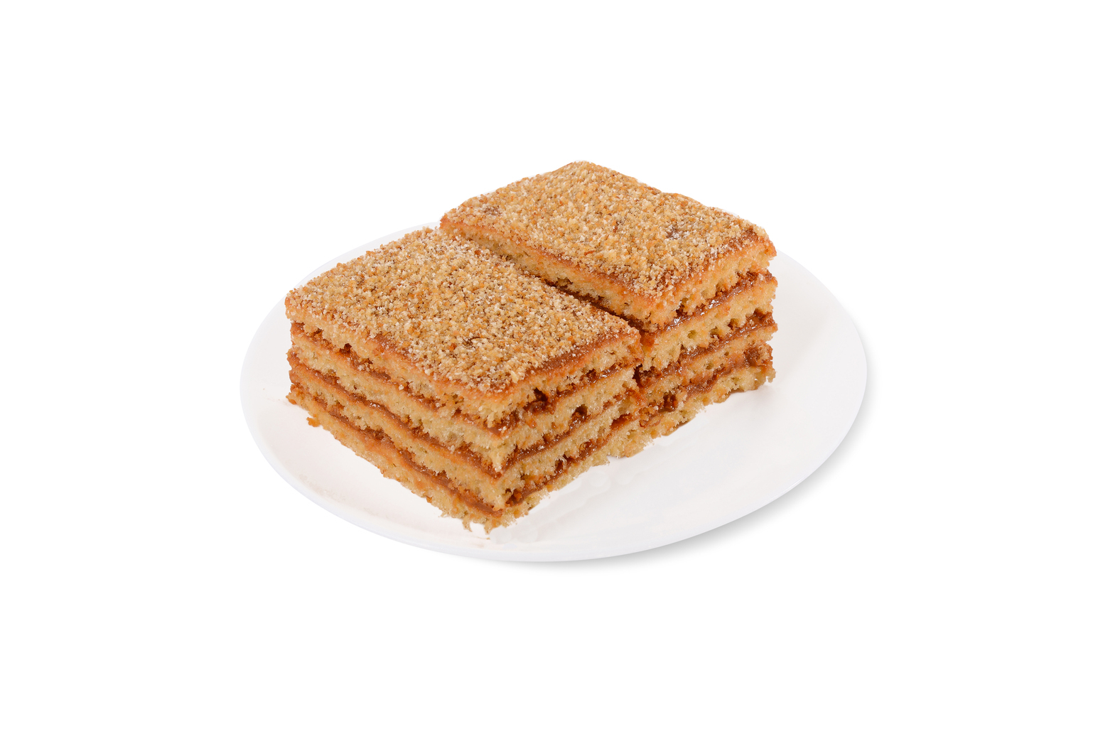 Медовые бисквитики, прослоенные вареной сгущенкой, поверхность отделана крошкой
