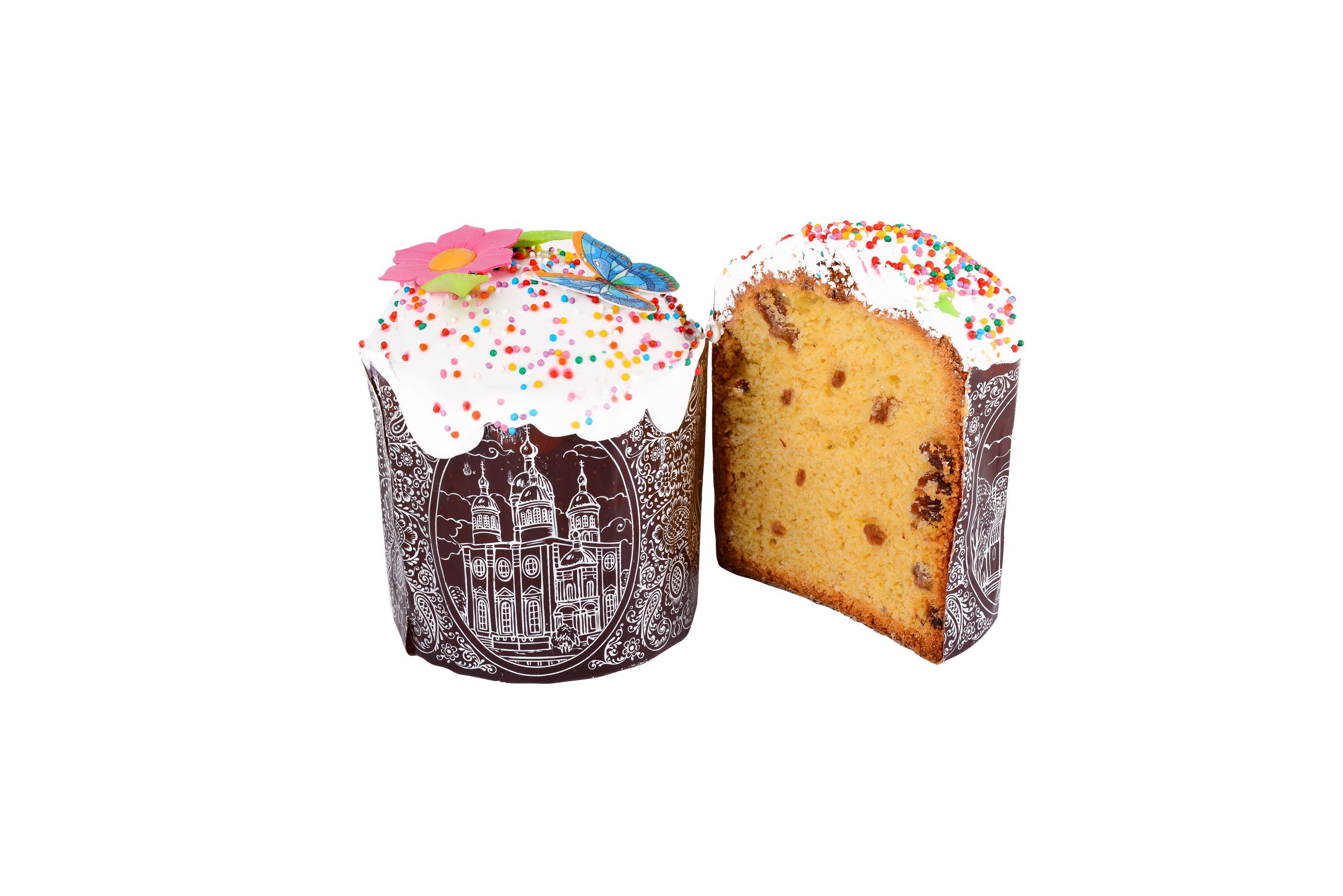 Кондитерский кулич с изюмом (бездрожжевой), отделанный помадкой, декоративной посыпкой и вафельными картинками.