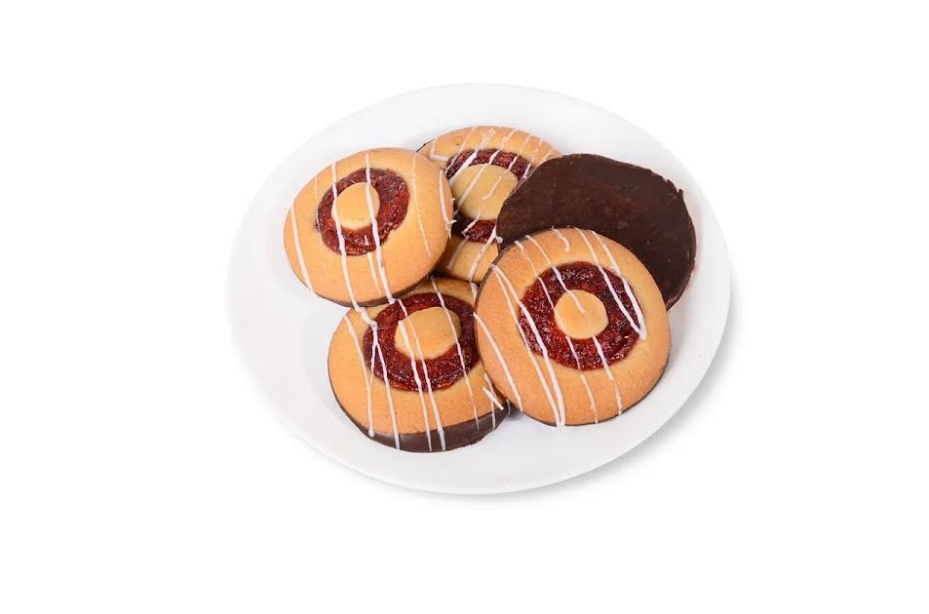 Сдобное печенье с творожным вкусом и вишневым повидлом, донышко в шоколадной глазури, поверхность декорирована белой глазурью
