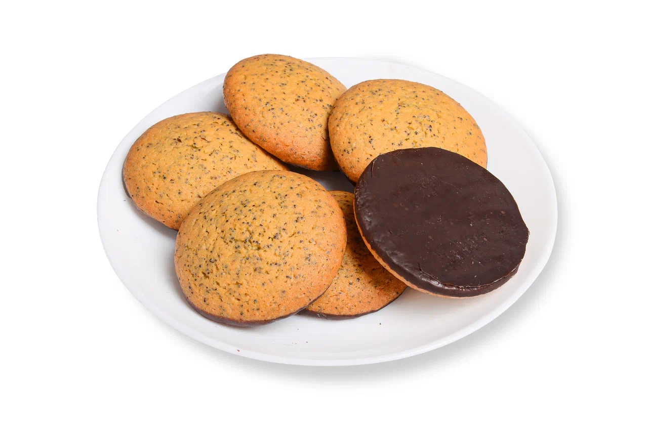 Маковое бисквитное печенье, донышко в шоколадной глазури.