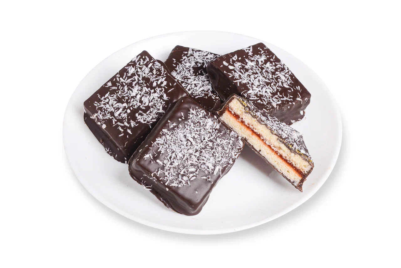 Нежные бисквиты, прослоены ароматным повидлом, в шоколадной глазури, поверхность декорирована кокосовой стружкой.