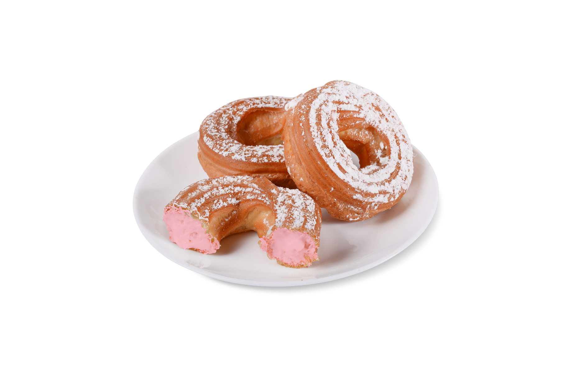 Заварное печенье с начинкой их взбитых сливок с клубничным вкусом, поверхность отделана сахарной пудрой