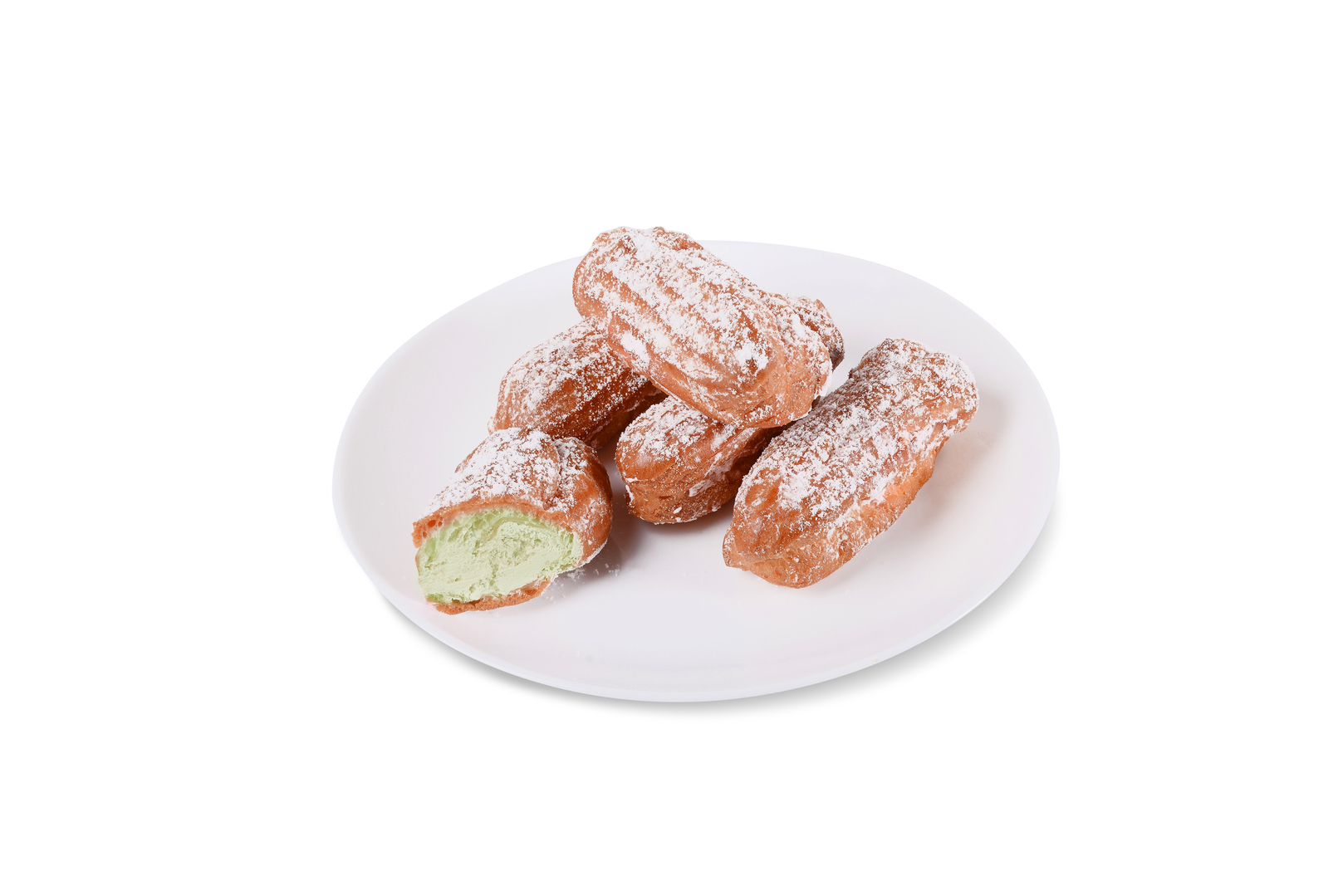 Заварное печенье с начинкой их взбитых сливок с фисташковым вкусом, поверхность отделана сахарной пудрой